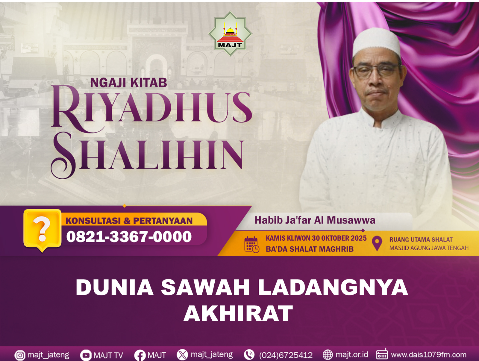 Mari hadir dan ikuti Ngaji Kitab Riyadhus Shalihin, ba'da shalat Maghrib di ruang utama shalat Masjid Agung Jawa Tengah, pada :
