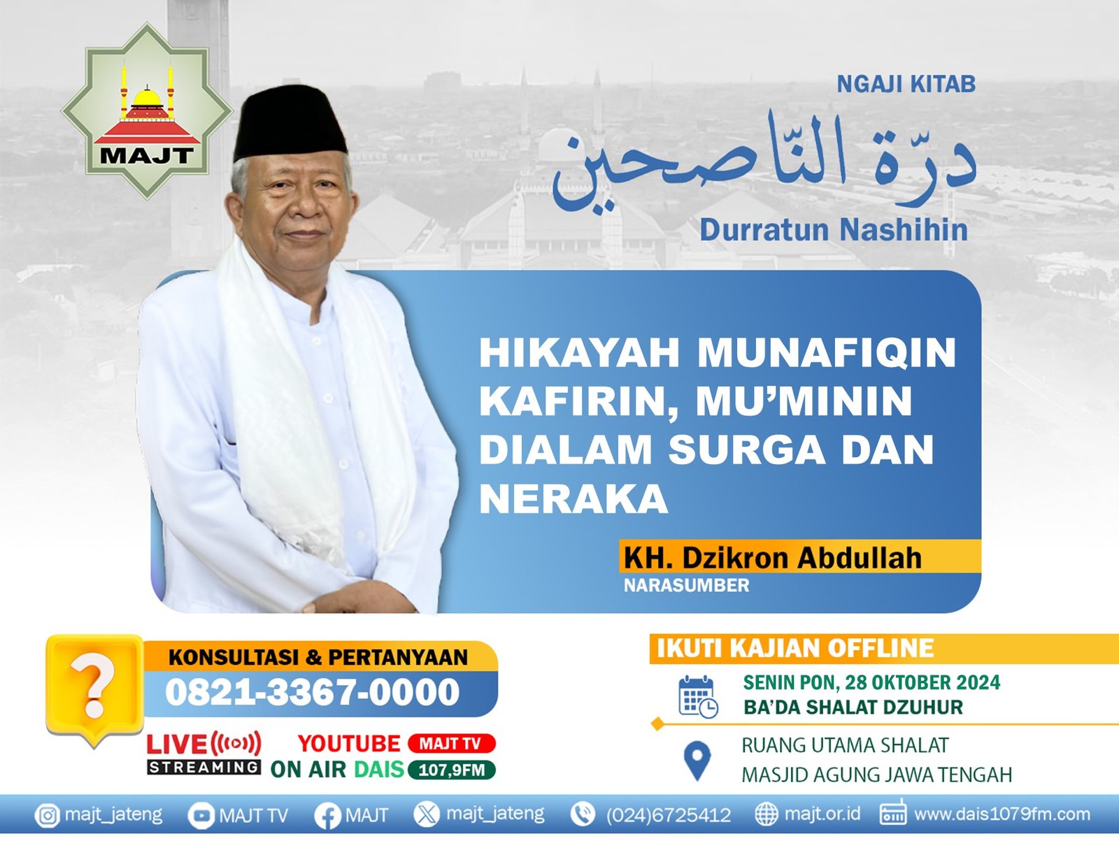 Mari hadiri dan ikuti majelis-majelis ilmu di Masjid Agung Jawa Tengah. Bagi yang berhalangan hadir, kajian ini akan disiarkan langsung melalui: