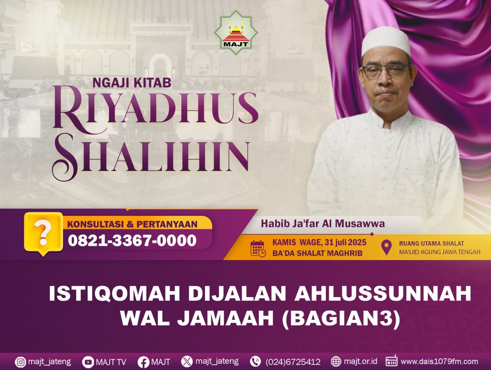 Mari hadir dan ikuti Ngaji Kitab Riyadhus Shalihin, ba'da shalat Maghrib di ruang utama shalat Masjid Agung Jawa Tengah, pada :