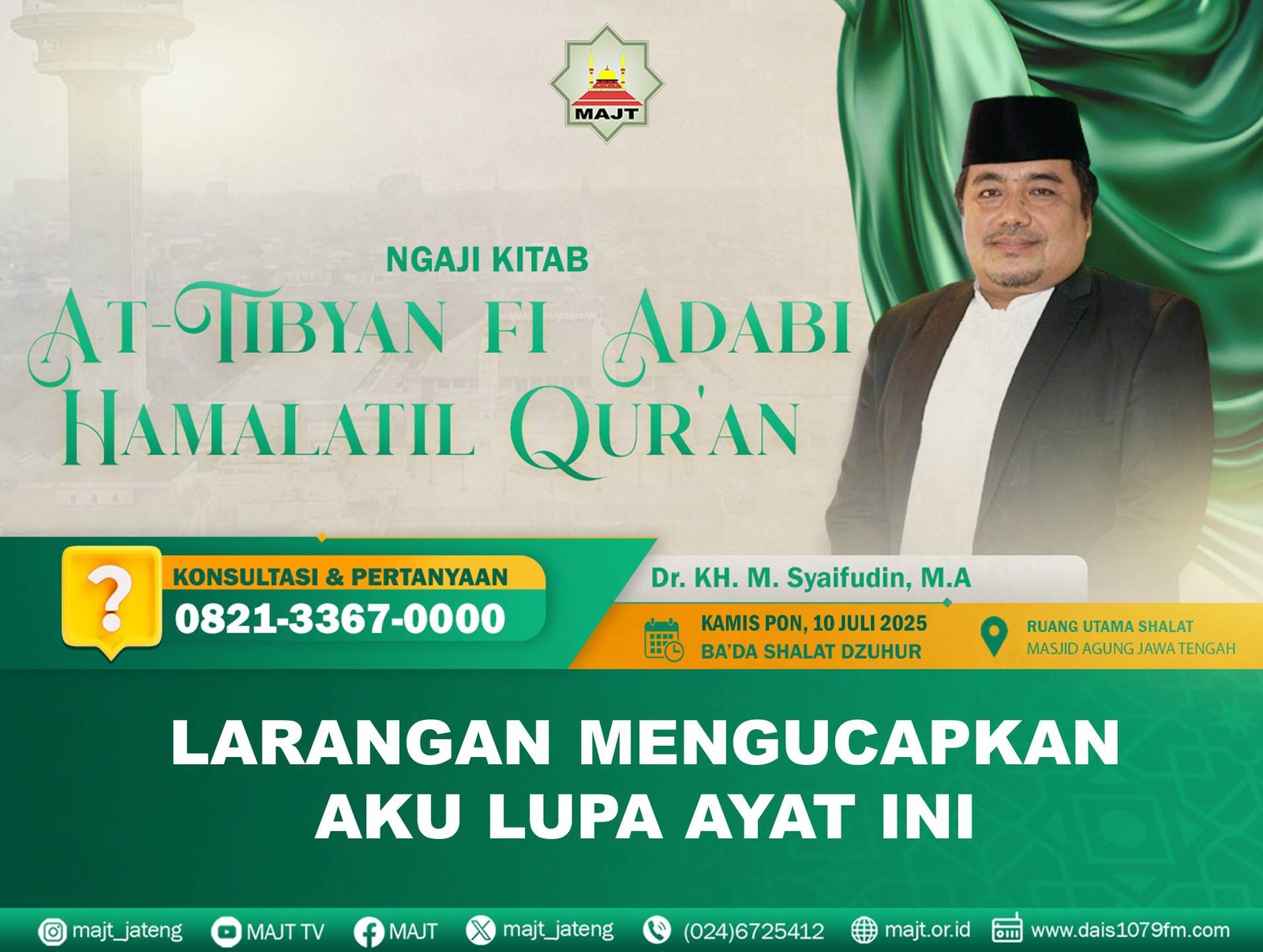 Mari hadir dan ikuti ngaji Kitab At-Atibyan Fi Adabi Hamalati Quran, ba’da Shalat Dzuhur di ruang utama Shalat Masjid Agung Jawa Tengah, pada :